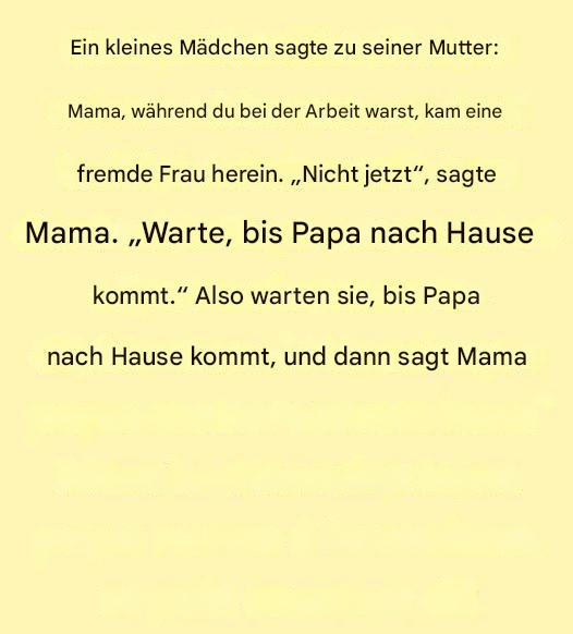Das kleine Mädchen sitzt am Tisch, spielt unschuldig mit ihrem Löffel und beobachtet dabei ihre Mutter. „Mama, während du bei der Arbeit warst, ist eine fremde Frau ins Haus gekommen.“ Mama, die gerade damit beschäftigt ist, Einkäufe wegzuräumen, hält plötzlich inne. „Eine fremde Frau? Mal sehen, wenn Papa nach Hause kommt.“ Der Ton ist trocken, … Lire la suite