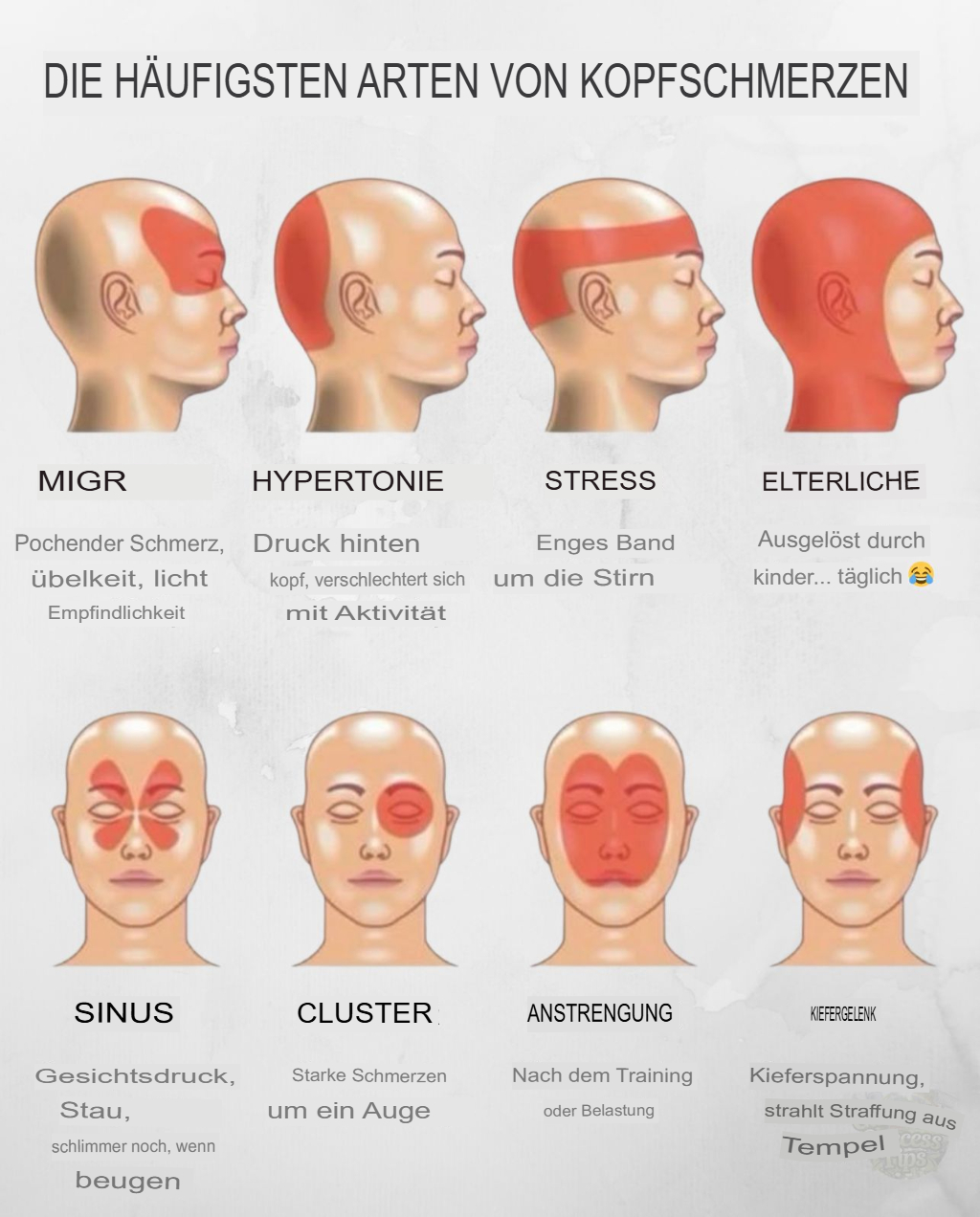 Die häufigsten Kopfschmerzarten und ihre Schmerzpunkte – Migräne Wo: Auf einer Seite des Kopfes, hinter dem Auge oder an der Schläfe Fühlt sich an wie: Pochender, intensiver Schmerz Andere Anzeichen: Übelkeit, Licht- und Geräuschempfindlichkeit – Bluthochdruck Kopfschmerzen Wo: Am Hinterkopf Fühlt sich an wie: Dumpfer, pulsierender Schmerz Hinweis: Morgens schlimmer, in Verbindung mit hohem Blutdruck … Lire la suite